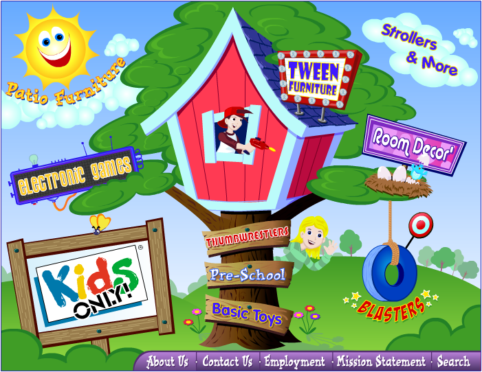 Kids Only Toys was recently purchased by Jakks Pacific, so unfortunately this interface is no longer online. I've managed to preserve it on my own website, so while the links themselves no longer work, feel free to roll over the landscape to view the animations and interactions which occur!