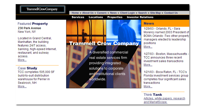 I was designer and Flash developer for Easter Research Group's redesign of Trammell Crow Company's website. Leading up to the design of the site I established a new look and feel for the company's print materials, utilizing abstract architectural imagery along with the black and orange color scheme of the company's existing branding. These new design elements were a natural fit for the new design of the website, and subtle use of Flash animation helped create a dynamic feel to the site's overall experience.